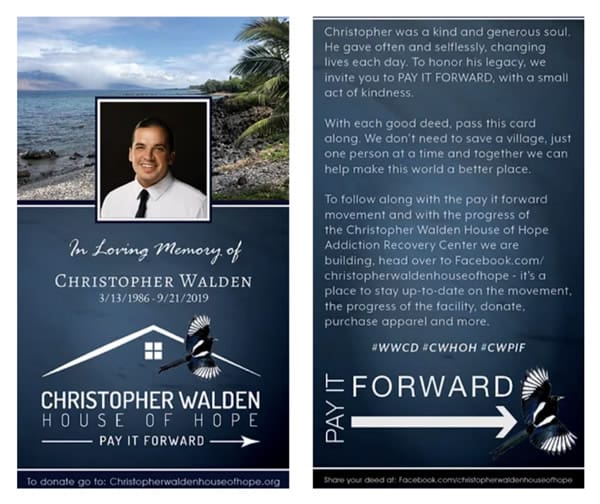 The Christopher Walden Pay it Forward Movement Cards are in honor of Christopher’s kind and giving spirit to always be willing to help others. These cards were developed to keep his legacy moving forward and to make a difference in someone day.
